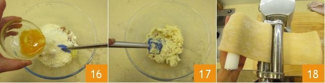Añadid también el huevo 16, ajustad de sal y pimienta y mezclad bien para incorporar los ingredientes 17. El relleno está listo: podéis cubrirlo y ponerlo en el frigorífico. Tomad la pasta fresca y dividid la masa en dos partes, colocando en el frigorífico la masa que no trabajaréis de inmediato, siempre dejándola cubierta con film. Trabajad la primera masa de pasta y estiradla en la máquina estiradora 18, comenzando con el grosor más grande hasta llegar al penúltimo número: debéis obtener dos hojas de alrededor de medio milímetro de espesor. Luego, proceded con la otra masa, de modo que obtengáis dos hojas del mismo espesor.