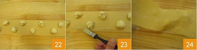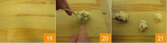 Colocad las hojas estiradas sobre la superficie de trabajo 19 y comenzad a distribuir sobre una de las dos hojas una cucharadita de relleno a la vez, formando montoncitos espaciados entre ellos 2 o 3 centímetros y colocados de manera escalonada (20-21).
