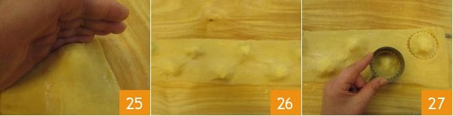 y, ayudándoos con las manos, sellad la pasta alrededor del relleno 25, de modo que salga todo el aire 26. Con un cortador de pasta de un diámetro de 6 cm cortad los tortelli 27