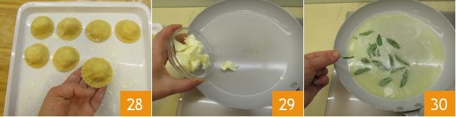 colocándolos de vez en cuando sobre una bandeja espolvoreada con un poco de harina 28 o sobre un paño limpio y seco. Poned al fuego una olla con abundante agua salada a hervir, donde coceréis los tortelli. Mientras tanto, en una sartén grande, derretid la mantequilla 29 y añadid las hojas de salvia 30.