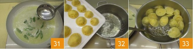 Salad y pimentad y añadid un cucharón de agua caliente tomado de la olla de los tortelli 31. Cuando el agua haya llegado a ebullición, verted los tortelli 32 y dejadlos cocinar durante un par de minutos 33.