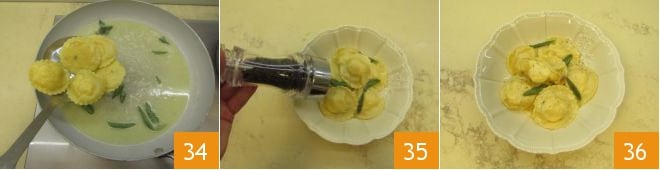 Cuando estén cocidos, escurridlos con una espumadera y añadidlos a la sartén con el condimento 34. Saltead los tortelli con la mantequilla y la salvia por un momento, moviéndolos muy delicadamente para no romperlos. Emplatad, espolvoreando con un poco de pimienta negra molida 35 antes de servir. ¡Vuestros tortelli de patatas y panceta con mantequilla y salvia están listos para ser disfrutados 36!