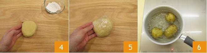 Continuad trabajando la masa hasta que esté lisa y compacta 4, luego envolved la pasta en film transparente 5 y dejadla reposar durante 30 minutos en un lugar fresco y seco. Mientras tanto, ocupáos de las patatas: lavadlas y ponedlas a cocer en agua hirviendo enteras y con su piel 6, dejándolas cocinar durante unos 40 minutos, hasta que estén tiernas. Cuando estén cocidas, escurridlas y dejadlas enfriar.