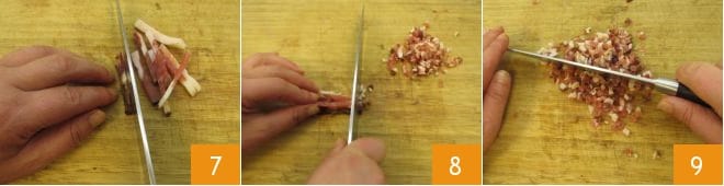 Pasad ahora a la panceta: cortadla primero en tiras 7, luego en cubos 8 y finalmente picadla finamente con un cuchillo, para obtener trozos muy pequeños 9.