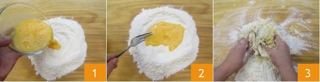 Para preparar los tortelli de patatas y panceta con mantequilla y salvia, empezad por la preparación de la masa para los tortelli: verted la harina sobre una superficie de trabajo (podéis reservar un poco de harina y añadir más según sea necesario a medida que trabajáis la masa) y en el centro agregad los huevos 1. Batidlos un poco con el tenedor para mezclar los ingredientes 2 y luego compactad con las manos. Si la masa os resulta dura o no logra incorporar toda la harina, podéis añadir una o dos cucharadas de agua tibia. Si, por el contrario, la masa os parece demasiado líquida, añadid un poco de harina extra según sea necesario 3.