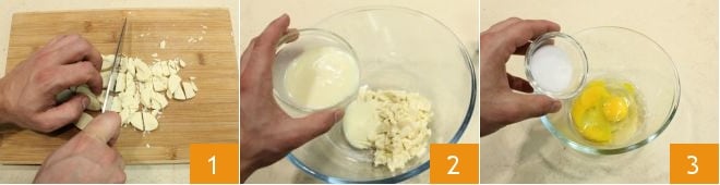 Para preparar los pastelitos de chocolate blanco, leche condensada y frambuesas, comienza picando groseramente el chocolate blanco 1, viértelo en un bol, añade la leche condensada 2 y fúndelos en el microondas (o al baño maría, evitando que el agua de la cacerola llegue al fondo del recipiente donde derretirás el chocolate y la leche condensada). En un bol aparte, mezcla los huevos con el azúcar 3