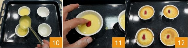 Vierte la mezcla hasta llenar ¾ del molde 10 e inserta una frambuesa en el centro 11. Hornea los pastelitos en un horno estático precalentado a 190° durante unos 10 minutos (170° durante 5-6 minutos para un horno ventilado, girando la bandeja a mitad de cocción). Cuando estén cocidos, sácalos del horno 12.