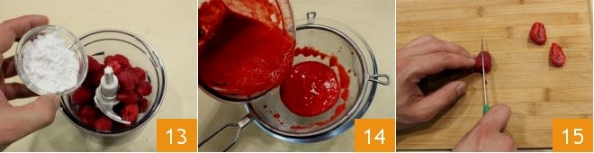 Mientras los pastelitos se hornean, prepara la coulis de frambuesas de acompañamiento: en una licuadora, vierte las frambuesas frescas (reserva algunas para la decoración) y el azúcar glas 13; licúa todo para obtener un puré homogéneo, pásalo por un colador de malla fina 14 para eliminar posibles semillas o grumos. Luego, divide a la mitad las frambuesas que dejaste enteras, para la decoración 15