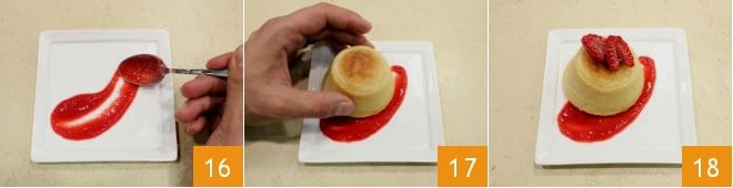 Distribuye la coulis como espejo en un plato de servir 16, desmolda los pastelitos de chocolate blanco, leche condensada y frambuesas y colócalos boca abajo sobre la coulis 17, decóralos con las frambuesas frescas y sirve.
