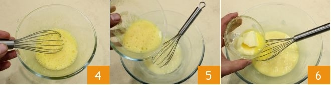 bátelos ligeramente con un batidor de varillas 4 y luego agrega la mezcla de chocolate blanco fundido templado 5 junto con la mantequilla fundida también templada 6.