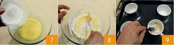 A continuación, tamiza la harina y el almidón de maíz y únelos a la mezcla obtenida (7-8). Unta con mantequilla y espolvorea con harina 4 moldes de aluminio desechables 9.