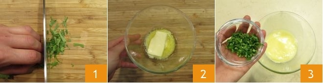 Para realizar la tostada mantequilla y sardinas, lo primero que debes hacer es picar el perejil 1, derretir la mantequilla en un bol pequeño 2, lo suficiente para obtener una crema, y añadir el perejil picado 3