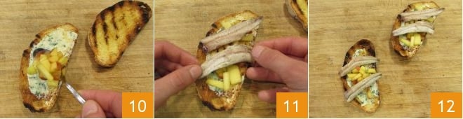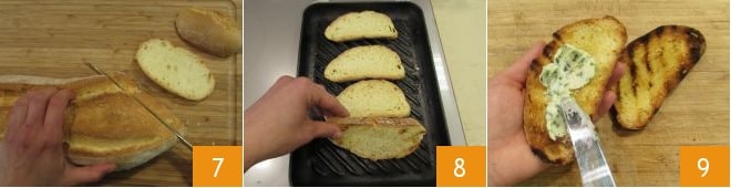 Corta en rodajas el pan casero 7, calienta una parrilla y tuesta el pan 8 hasta que esté dorado y crujiente. Todo está listo para componer las tostadas: toma una rebanada de pan tostado, unta encima la crema de mantequilla 9