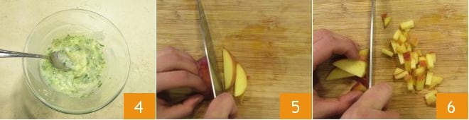 y mezclar 4. Deja a un lado la salsa de mantequilla y ocúpate del melocotón: lávalo, divídelo por la mitad, elimina el hueso y luego córtalo primero en rodajas 5 y de estas saca daditos 6. Reúne los dados en un bol.