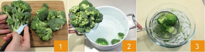 Para preparar los triangulitos de pasta filo con brócoli y ricotta, empezad con las verduras: lavad el brócoli y separad las floretes del tallo central 1, poned el brócoli en una olla con agua hirviendo y blanqueadlo durante unos minutos 2, luego escurridlo con una espumadera y ponedlo directamente en un bol con agua y hielo 3,