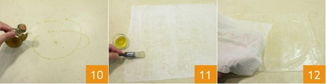 Engrasad la superficie de trabajo 10 colocad la primera hoja y engrasadla en toda la superficie 11 colocad la segunda y haced el mismo procedimiento también con la tercera hoja 12.