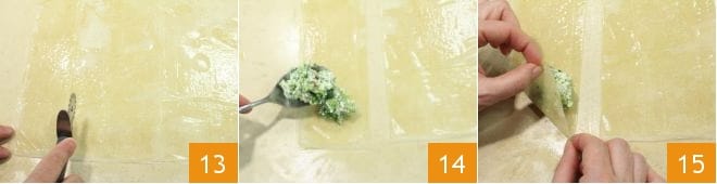 Cortad ahora con un cortador de masa liso tiras de 8 cm de ancho 13, distribuid el relleno con una cuchara en la base del rectángulo 14 y formad los triangulitos: tomad la esquina inferior izquierda del rectángulo y doblarla por la mitad sobre el lado largo del rectángulo de pasta 15