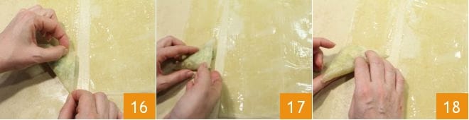 de manera que se forme un triángulo 16. Continuad envolviendo el triángulo de pasta sobre sí mismo hasta el final de la tira (17-18).