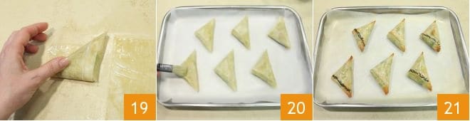 Así habréis creado los rollitos triangulares 19, continuad con la pasta filo restante. Obtendréis 12 triángulos, colocadlos en una bandeja forrada con papel de horno 20, pincelad la superficie con aceite y espolvoread la superficie con semillas de sésamo 21. Coced los triangulitos en el horno estático precalentado a 200° durante 20-25 minutos (en horno ventilado a 180° durante 15-20 minutos). Una vez cocidos, sacad los triangulitos de filo con brócoli y ricotta y dejadlos templar antes de servirlos.