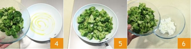 esto detendrá la cocción de las verduras y mantendrá el color vivo. Verted un poco de aceite en una sartén y poned el brócoli ya frío 4 dejad que coja sabor durante un par de minutos, salpimentad y apagad el fuego 5. En otro bol, poned la ricotta, luego añadid el brócoli salteado en la sartén 6.