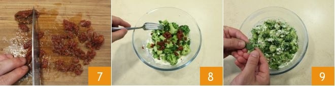 Escurrid los tomates secos en aceite y secadlos con un papel de cocina, cortadlos en trozos pequeños 7 e incorporadlos al relleno, salpimentad y mezclad la mezcla 8. Para terminar, aromatizad el relleno con las hojas de menta 9.