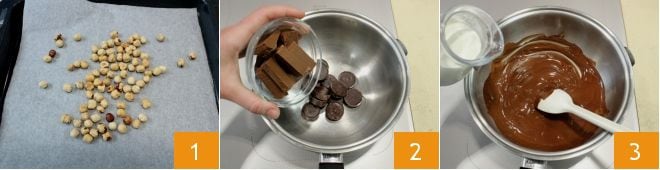 Para preparar las trufas, empieza tostando las avellanas en una bandeja forrada con papel de horno 1, en horno estático precalentado a 150° durante 30 minutos (130° durante 20 minutos si es horno ventilado). Mientras tanto, derrite al baño maría el chocolate negro y gianduja 2, removiendo con una cuchara de madera (el agua contenida en el cazo no debe llegar a tocar el recipiente donde derrites el chocolate). Cuando se haya derretido completamente, añade también la nata fresca líquida 3 y continúa mezclando.