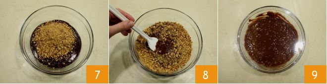 Después, únelas a la mezcla de chocolate en el bol 7 y mezcla con una cuchara de madera para integrar los ingredientes 8. Cubre la masa con papel transparente 9 y déjala endurecer en el frigorífico durante 2-3 horas, hasta que esté bien firme y compacta.