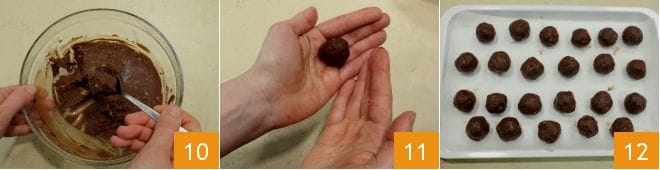 En este punto, toma una cucharadita de mezcla a la vez (aproximadamente 10 g) 10; para esta operación también puedes usar un dosificador de helado. Trabaja las bolitas con las manos para darles una forma más regular 11. A medida que las formes, deposita las bolitas en una bandeja 12, que luego colocarás en el frigorífico para que se endurezcan al menos 1 hora.