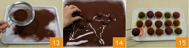 Después, espolvorea una bandeja con el cacao amargo tamizado 13 y haz rodar las trufas 14 para cubrirlas cuidadosamente. Sirve las trufas dentro de pequeños moldes de papel de colores 15!
