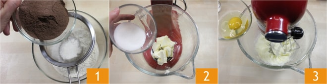 Para preparar los whoopies al Nesquik con crema stracciatella, primero prepara las tortitas: mezcla en un bol el Nesquik y la harina tamizada, la levadura, el pellizco de sal 1 y reserva. En el bol de una batidora plana equipada con varillas, alternativamente puedes usar una batidora eléctrica, pon la mantequilla que deberá estar a temperatura ambiente y el azúcar 2, bate durante unos minutos luego añade el huevo 3,