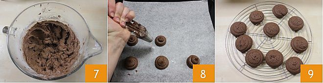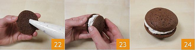 hasta obtener una mezcla homogénea 7. Pon la masa obtenida en una manga pastelera con boquilla lisa de 2 cm de diámetro. Exprime montones de masa de aproximadamente 4 cm de diámetro en una bandeja forrada con papel de horno (deberás obtener semiesferas bastante altas) para un total de aproximadamente 15 montones por bandeja 8. Hornea en horno estático precalentado a 180° durante aproximadamente 13-14 minutos (160° durante 10 minutos en horno ventilado), luego saca los whoopies del horno y transfiérelos a una rejilla 9. Deja enfriar los whoopies.
