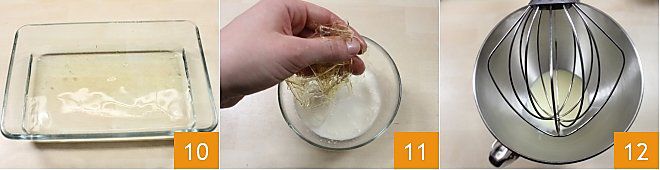 Mientras tanto puedes preparar la crema stracciatella. Pon a remojo la gelatina en agua fría durante 10 minutos 10, luego escúrrela y disuélvela en 50 ml de nata que habrás calentado en el microondas 11. En el bol de una batidora plana equipada con varillas pon la leche condensada Nestlé a temperatura ambiente 12,
