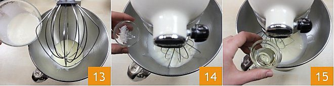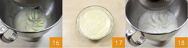 y deja que las varillas trabajen durante 5 minutos 16. Luego transfiere la crema a un bol pequeño y cúbrela con film transparente 17 y deja enfriar en el frigorífico durante 5 minutos para que alcance la misma temperatura que la nata que montarás después. Este paso es fundamental para no crear grumos en la crema. Toma la nata fría y móntala 18 con una batidora plana equipada con varillas, o con una batidora eléctrica