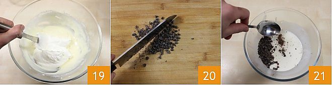 una vez montada a punto de nieve agrégala a la mezcla previamente preparada y enfriada 19, mezclándola girando de abajo hacia arriba con una espátula de goma para no desmontar la nata. Pica las gotas de chocolate con un cuchillo 20 y agrégalas a la crema mezclando para integrarlas bien 21.