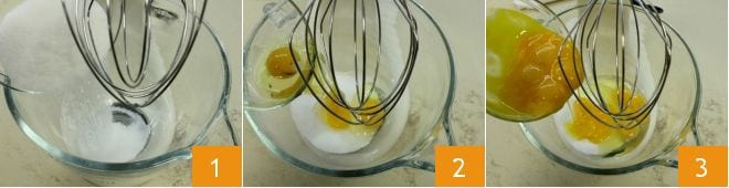 Para preparar el zuccotto de uva fresa, comenzad con el bizcocho de cacao (podéis consultar el procedimiento también aquí: Bizcocho de cacao). Verted el azúcar en el bol de una batidora (si no tenéis, podéis utilizar un bol profundo y una batidora eléctrica) 1, añadid los huevos enteros 2 y las 8 yemas 3.
