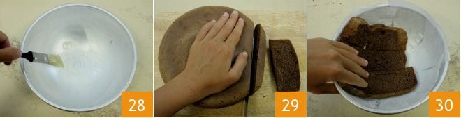 Luego pasad a engrasar un molde para zuccotto de 21,5 cm de diámetro 28 y forradlo con papel de horno. Cortad el bizcocho en rebanadas de aproximadamente 1 cm 29 y forrad el molde 30.
