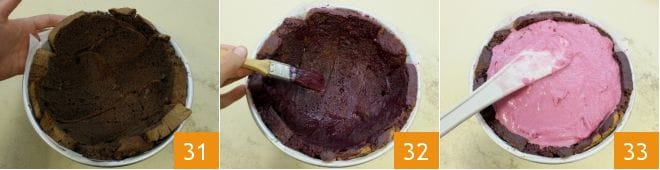 Ahora que habéis forrado el zuccotto 31 tomad el almíbar de uva fresa y pincelad cuidadosamente el bizcocho 32. Luego sacad del congelador el helado, vertedlo en el zuccotto y nivelad ayudándoos con una espátula 33.