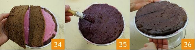 Cubrid el helado con más rebanadas de bizcocho 34 y pincelad también estas con el almíbar de uva fresa 35. Guardad el zuccotto en el congelador hasta que esté completamente firme (tomará aproximadamente 2 horas). Cuando esté bien firme, desmoldadlo delicadamente: para facilitar la operación podréis sumergir rápidamente el zuccotto en un bol de agua hirviendo solo por unos segundos 36.
