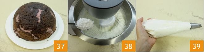 Voltead delicadamente el zuccotto sobre un plato de presentación 37. Finalmente montad la nata que servirá para decorar el zuccotto. En una batidora (o en un bol con una batidora eléctrica) verted la nata fresca, encended las varillas y añadid el azúcar glas 38. Cuando la nata esté bien montada, transferid la mezcla a una manga pastelera con boquilla de estrella 39. Para montar la nata podéis mirar el procedimiento en detalle aquí: cómo montar la nata.