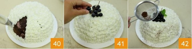 Comenzad a decorar el zuccotto de uva fresa cubriendo con copos de nata toda la superficie 40. Luego terminad con un racimo de uva fresa 41 y, si lo deseáis, con unas hojas de menta y una pizca de cacao amargo 42. ¡Conservad vuestro zuccotto de uva fresa en el congelador y sacadlo unos 15 minutos antes de servir!