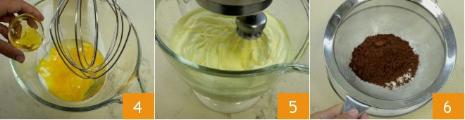 Luego verted la miel 4, encended las varillas y montad los ingredientes durante unos 15 minutos hasta obtener una mezcla esponjosa y homogénea 5. En un bol pequeño aparte tamizad juntos la fécula (o el almidón de maíz), la harina y el cacao 6.