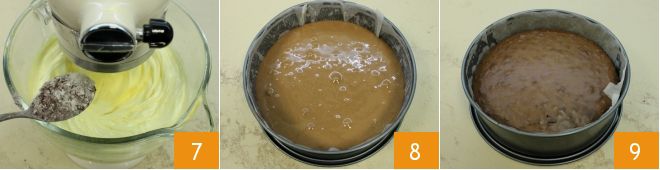 Luego incorporad los polvos tamizados juntos en la crema obtenida 7. Continuad batiendo con las varillas hasta amalgamar completamente los ingredientes. Luego tomad un molde de 24-26 cm de diámetro (mejor si es desmontable), engrasadlo y forradlo con papel de horno (podéis consultar el procedimiento aquí: cómo forrar un molde con papel de horno). Verted dentro la mezcla obtenida 8 y hornead en horno estático precalentado a 180° durante 45 minutos (si es horno ventilado, coced a 160° durante 35-40 minutos). Cuando el bizcocho esté listo, sacadlo del horno 9 y dejad que se temple ligeramente.