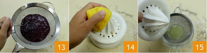 Pasad el jugo a través de un colador para eliminar las semillas y las pieles 13. Ahora exprimid el jugo de un limón 14 y filtradlo también con un colador de malla fina 15.