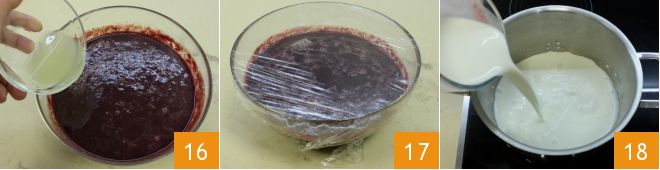Luego verted el jugo de limón filtrado en el bol con el jugo de uva fresa 16 y cubrid con film transparente 17. Guardad el bol en el frigorífico mientras continuáis con el resto de la preparación. Tomad un cazo grande, verted la nata fresca líquida 18.
