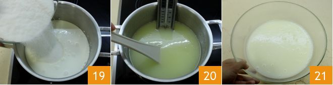 Luego añadid el azúcar 19. Encended el fuego medio y llevad la mezcla a una temperatura de 83°, verificando la temperatura con un termómetro para alimentos 20. Alcanzada la temperatura indicada, retirad la mezcla del fuego y enfriadla rápidamente en un abatidor o transferidla a un bol lleno de hielo para enfriarla muy rápidamente 21.