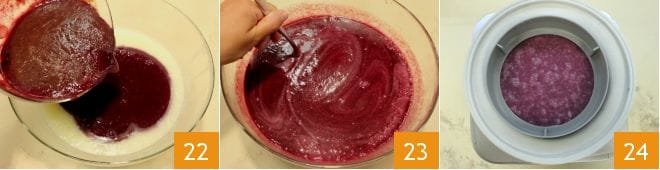 Cuando tanto la mezcla de nata y azúcar como el jugo de uva fresa estén bien fríos, mezcladlos (22-23) y transferidlos a la heladera 24. El recipiente de la heladera debe estar bien frío, por lo que recomendamos ponerlo en el congelador al menos la noche anterior.