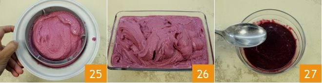 Poned en funcionamiento la heladera, hasta que la mezcla se haya espesado (tomará unos 30-35 minutos) 25. Luego verted el helado obtenido en un bol grande 26, niveladlo y dejadlo en el congelador durante al menos 30 minutos. Mientras tanto, pasad a preparar el almíbar para el bizcocho de cacao. Triturad la uva fresa necesaria para el almíbar como lo hicisteis anteriormente (secuencias 11-12-13) y verted el jugo obtenido en un bol pequeño. Luego alargad el jugo con 2 cucharadas de agua 27.